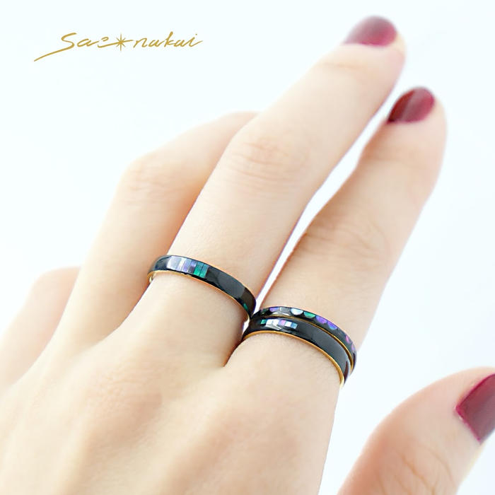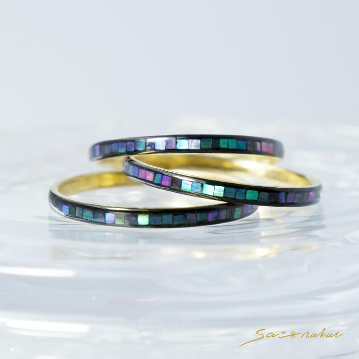 - これまで“螺鈿のジュエリー”を手にとって頂いた方には、重ねづけの相性が良いといった声が多くあります。暗い色の衣類とのコーディネートに対しては、重ねづけすることでジュエリーの存在感を増すことが出来ます。明るい色の衣類とのコーディネートに対しては、アクセントとなる色のネイルと共に重ねづけし、螺鈿のジュエリーを着用して頂くことで、ジュエリーのみが目立つことなく、より魅力的に身に付けることが出来ます。濃い色のジュエリーの身に付け方として、おすすめです。