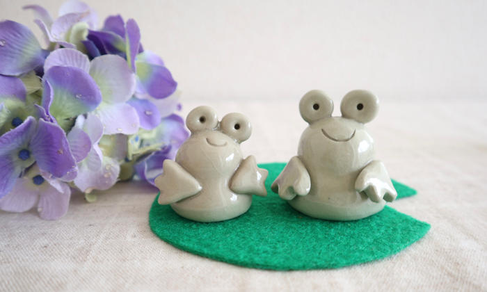 優しい色味の、萌黄土でつくったカエルの親子です。 -