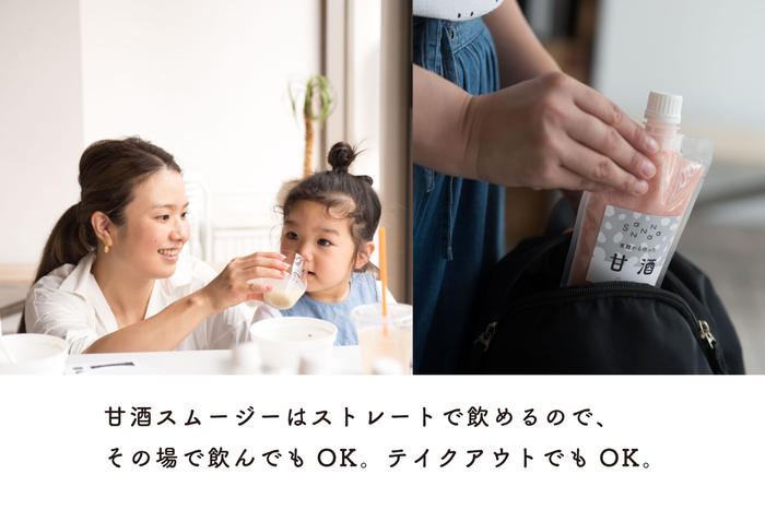 • 私たちが普段オススメしている召し上がり方は、甘酒をシャーベット状に凍らせてスムージーのように飲んでいただく飲み方です。すっきりとしていながら、お米の自然な甘さを感じる優しい味わいになります。また、福井県には味噌の原材料で使用しているお米や大豆の他にも、美味しいフルーツや野菜が豊富にあります。「甘酒スムージー」は地元の農家さんが作られた新鮮なフルーツや野菜を積極的に使用していきたいと考えています。