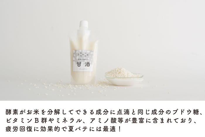 • 甘酒は近年、テレビなどでも飲む点滴などと言われ健康食品としても注目されており、便秘解消や疲労回復、美肌にも良いと言われています。ノンアルコールなのでお子様も安心して飲むことができます。しかし、甘酒と聞くと、甘酒独特の臭みや癖があって苦手な方も多く、流通している甘酒の中には常温で販売するため加熱処理をして発酵を止めていたり、砂糖を入れて甘くしているものまであり、体に良いとされる酵素の働きが失われているものもあります。