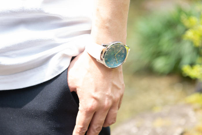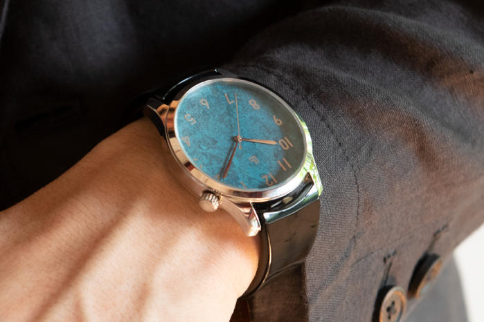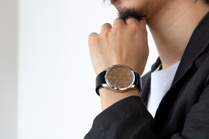 - 眼鏡職人が長年培った技術で、普段眼鏡をかけるように簡単な動作で腕時計をかけることを考えて製品化しました。文字盤は着色職人が手がけた発色&模様、ベルトの部分はメガネ素材アセテート、ベータチタンを使い、軽くて肌に優しい着け心地で、装着していることを忘れるぐらいの「ストレスフリー」なバングルウォッチです。