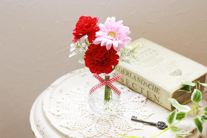 - 赤カーネーション・ピンクガーベラ・カスミ草をミニブーケのように束ねてガラスの花瓶にアレンジしました。
