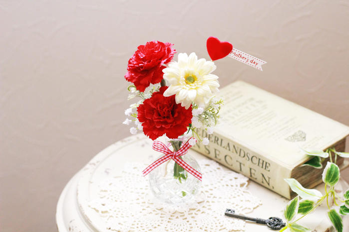 - 赤カーネーション・白ガーベラ・カスミ草をミニブーケのように束ねてガラスの花瓶にアレンジしました。