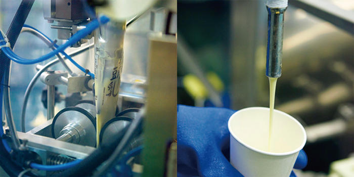 できあがったばかりの豆乳を80℃の高温のまま、瞬時にパッキングします。