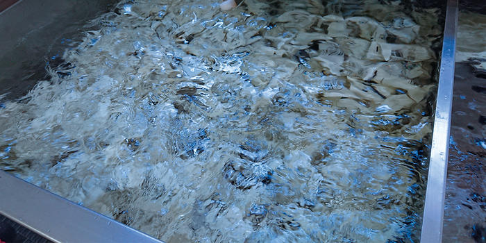 生産後はすぐに冷却水槽にて2℃の水温にて保管・管理し、出荷までの鮮度を最大限に保ちます。また、水冷循環により、夏場や冬場など、季節を問わず一定の温度管理を行うことで、一年を通してまったく同じ条件(温度管理)が維持できます。そうすることで添加物を使わなくても2週間の冷蔵保存が可能になるのです。 -