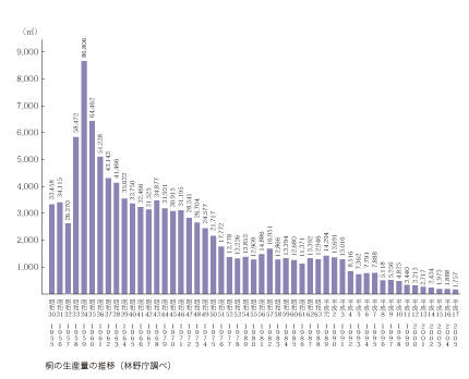 - 国産の桐材の生産量は毎年毎年減少し続けています