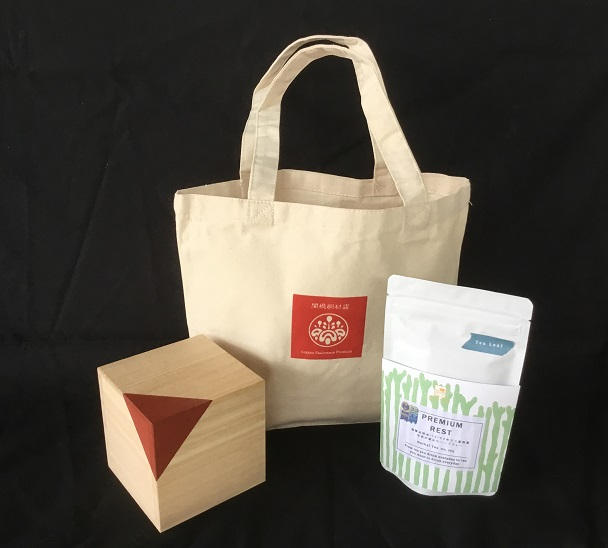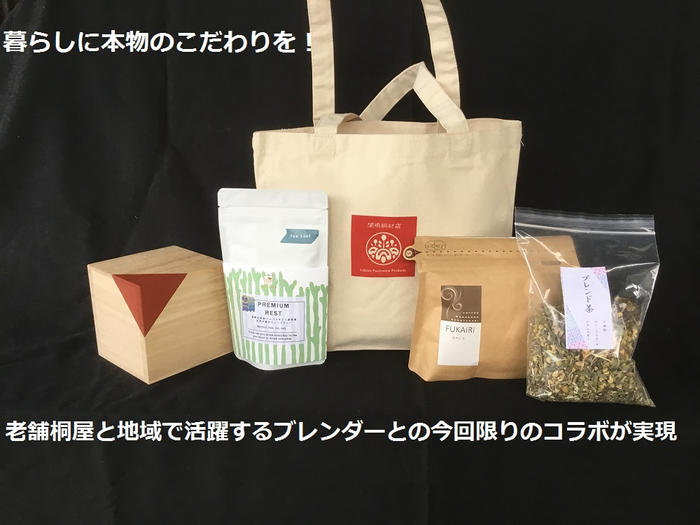 この桐コーヒーキャニスターと地域で活躍するこだわりのブレンダーによる「コーヒー豆」「ハーブティ」「薬膳茶」と当店オリジナルトートバッグをそれぞれセットにして提供いたします。