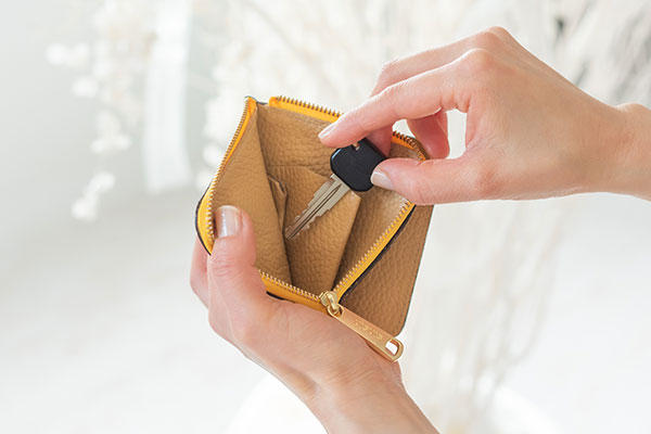 - 忘れ物防止タグのMAMORIOは小銭入れスペースに専用ポケットに収納できます。