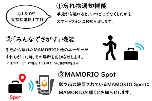 - MAMORIO(紛失防止タグ)を搭載したお財布です。万が一お財布をなくしてしまってもスマートフォンからアプリにアクセスすれば、「いつ」・「どこで」お財布を忘れてきてしまったのかわかります。