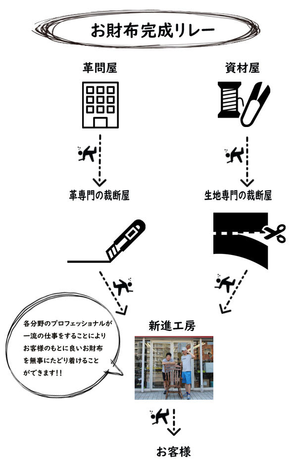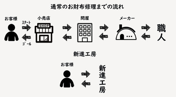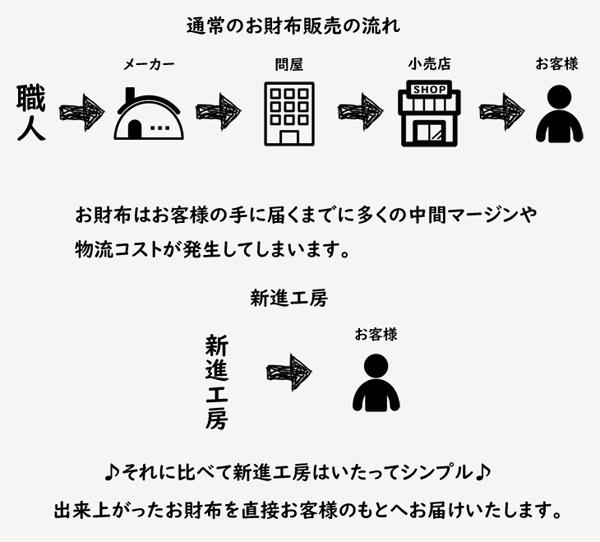 - お財布はお客様の手に届くまでに多くの中間マージンや物流コストが発生しています。それに比べて新進工房の仕組みはシンプルです。