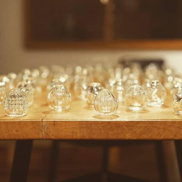 - 三つの指で持てるくらいのサイズの再生ガラスの一輪挿し。