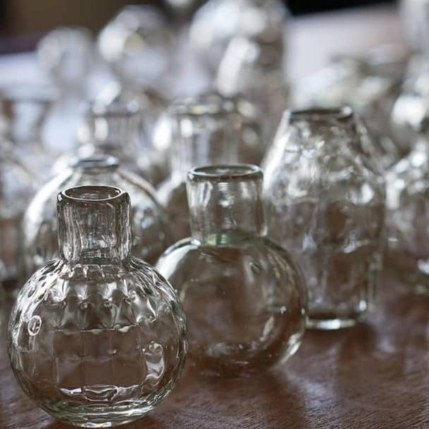 - 三つの指で持てるくらいのサイズの再生ガラスの一輪挿し。