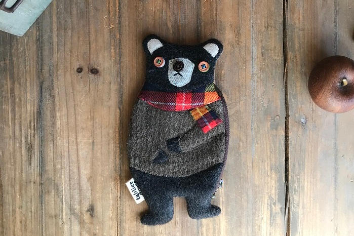 クマのボディに使用したのは、ブラックのウールモッサ。モッサとは「苔」のことで苔のように毛足を短くカットし仕上げたコートやジャケットに使われる生地です。獣毛混で染まりきらない糸がいい具合にミックスされ深みがあります。