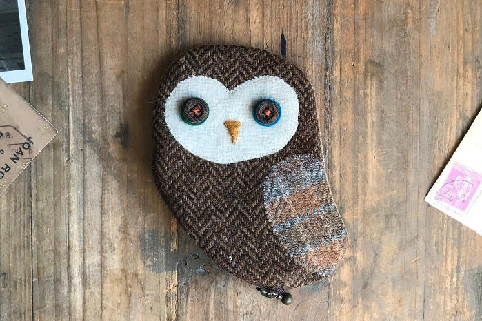 濃淡がくっきりとしたブラウンの糸で織られたヘリンボーンのウール地は、まるで本当のフクロウの羽のようです。同色のブラウンのチェックを翼に配しました。落ち着いた色合いの小ぶりなポーチです。カードやコスメなど小さい物を一気にまとめるしっかり者です。