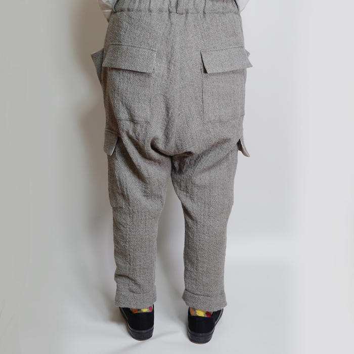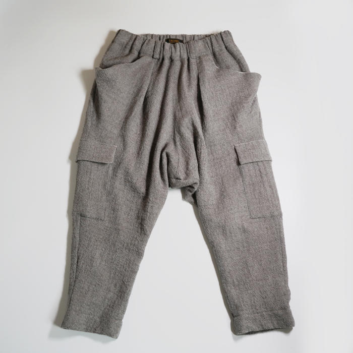 尾州産のふっくらウール100%のガーゼと保温効果のある素材を裏地にしたサルエルカーゴパンツ