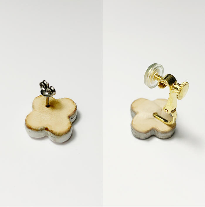 Type : イヤリング(ネジバネ式) materials : 磁器 牛革 ( 金具部分 : 真鍮+ gold plate *シリコンキャッチ付属 )