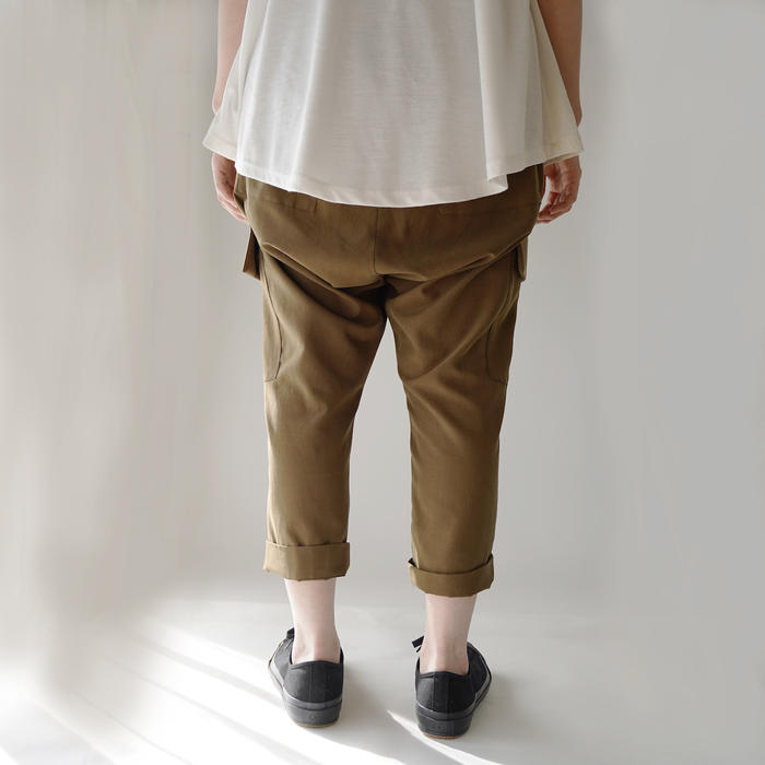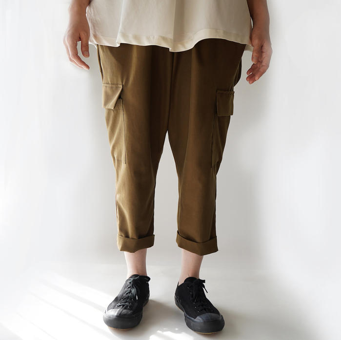 シルク/綿、50/50%のシルクならではのとろみのあるしなやかな生地を使用したサルエルパンツです。ウエストは広幅ゴムでゆったり、裾は少しシャープで動きやすく、カーゴタイプのポケット使いもミリタリーと女性らしさをあわせ持つ便利パンツです。 -