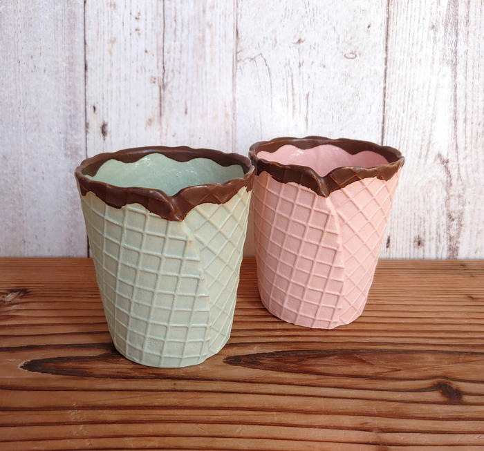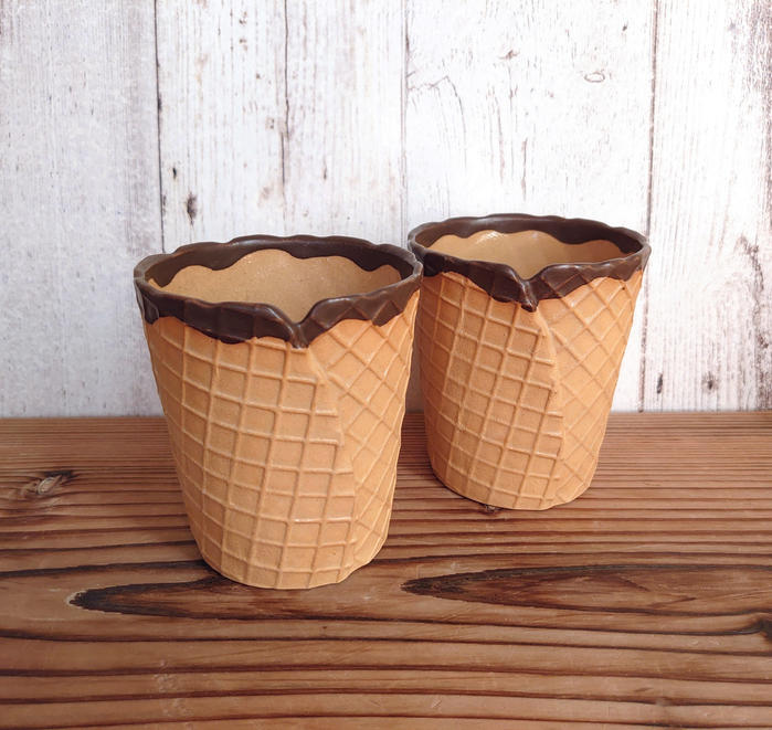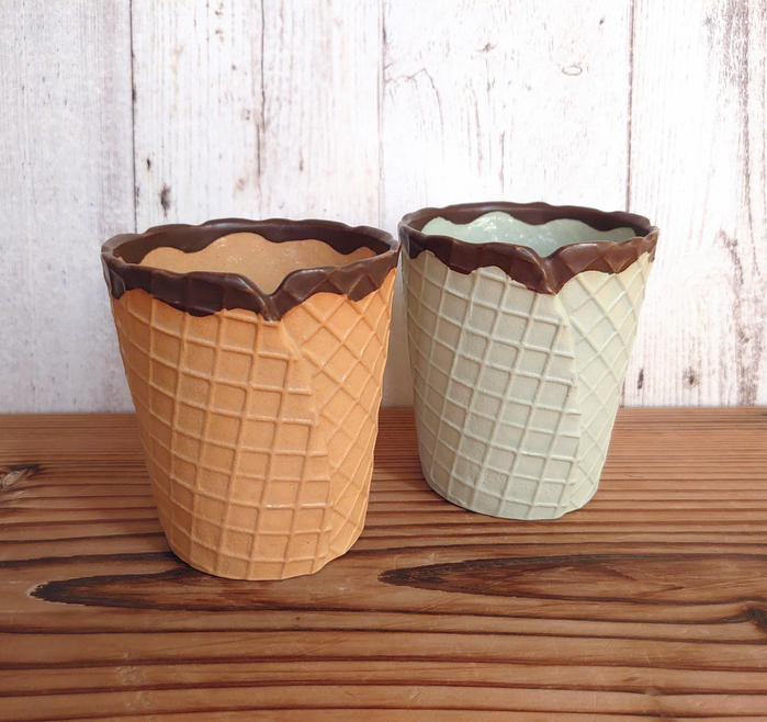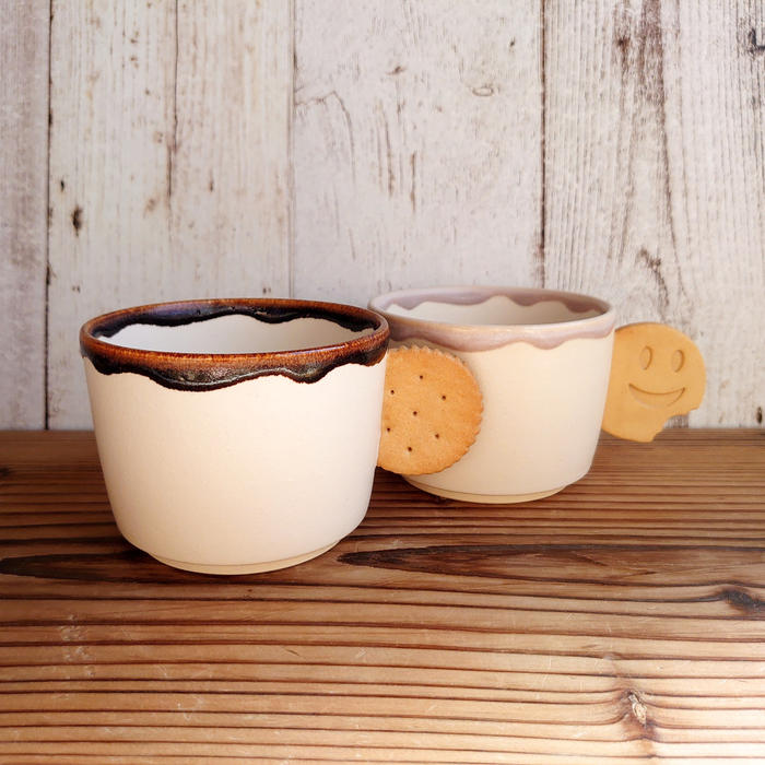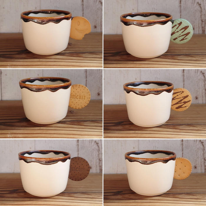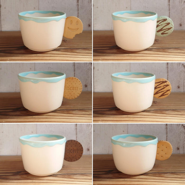 作品の最大の魅力である陶製のお菓子は焼き色や質感のリアルさを追求し、実験を重ねて得たものです。お菓子のリアルさにこだわった作品なので、一見そこだけに目が行きがちですが、本体にもこだわりがあり、独自に調合したオリジナルの釉薬を使用しています。チョコレートやミント、ストロベリー等スイーツを想定したカラーで釉薬を展開しております。また、マグカップにおいては持ち手に指が通せない形なので、本体カップを軽量に制作し、持ち心地にも配慮しております。 -