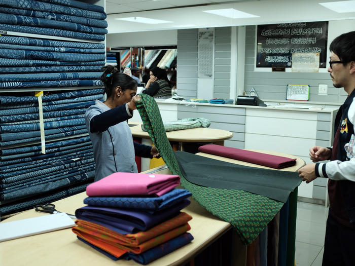 - 南アフリカにあるシュウェシュウェを数多く取り扱う生地屋さんにて