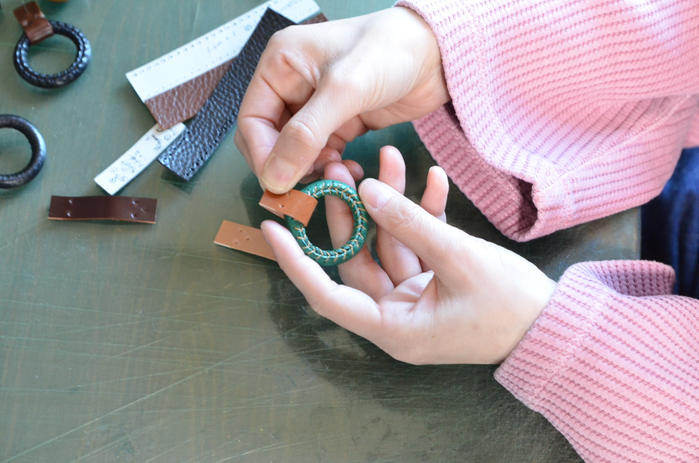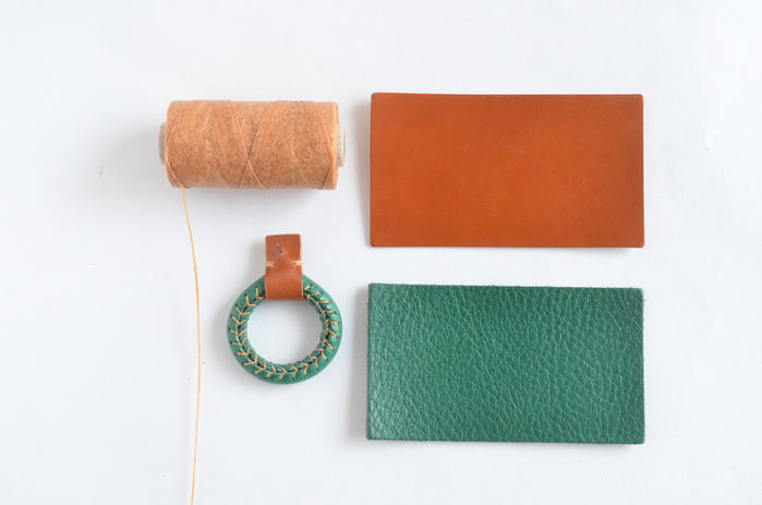 - ドーナツ部分の革を⑥Greenで、上の部分の革を②Camelで、ステッチを②キャメルで作りました。