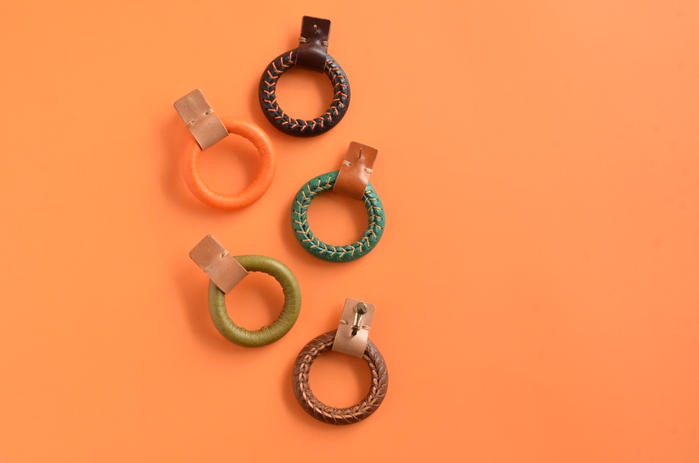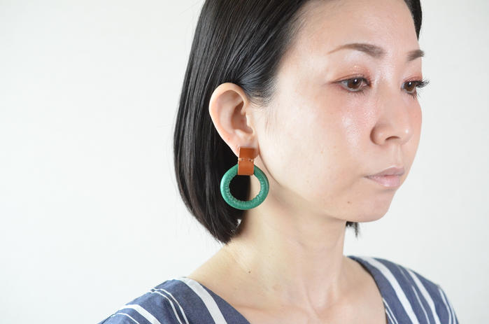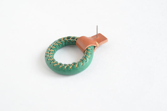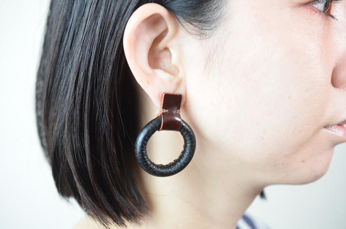 - 革の丸紐をグローブステッチを使いレザーで包み、ドーナツ状に仕上げてピアスにしました。