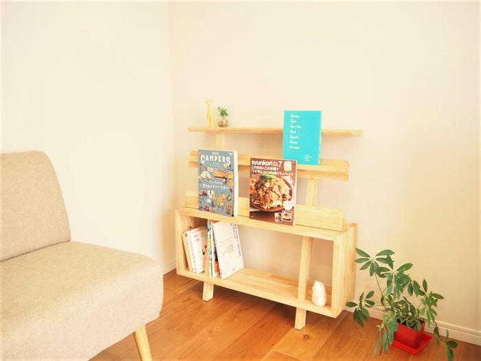 こだわりとしては、通常のただ収納する本棚ではなく、また、立て掛けるだけのマガジンラックとは違う、『飾れる本棚』を基にデザインを考えました。その為、下BOXには、本やモノの収納もしっかり出来、天面には小物を飾ったり、上方には雑誌、文庫本、絵本、ポストカードなどを色々飾る事が出来ます。