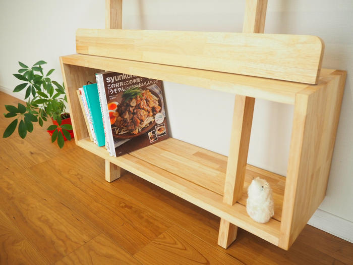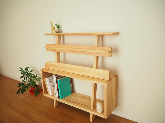 そして、2本脚にBOXが刺さったような形や、板にスリットを入れているので、全体的に可愛くスッキリしたフォルムになっているので、色々なモノを飾ってみたくなるような雰囲気の作品となっております。その為、リビングや子ども部屋に置いて頂いても、部屋を圧迫せずに、収納できるので、オススメです。
