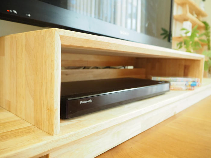 また、オープンのTV台にありがちな、配線のごちゃごちゃが見えてくると居心地が良くなるので、デッキ収納奥に、配線を隠す板とスペースを設け、極力、前面から見ても配線のごちゃごちゃが見えにくいですが、スペースを設けているので、配線も非常にやりやすいよう工夫しております。