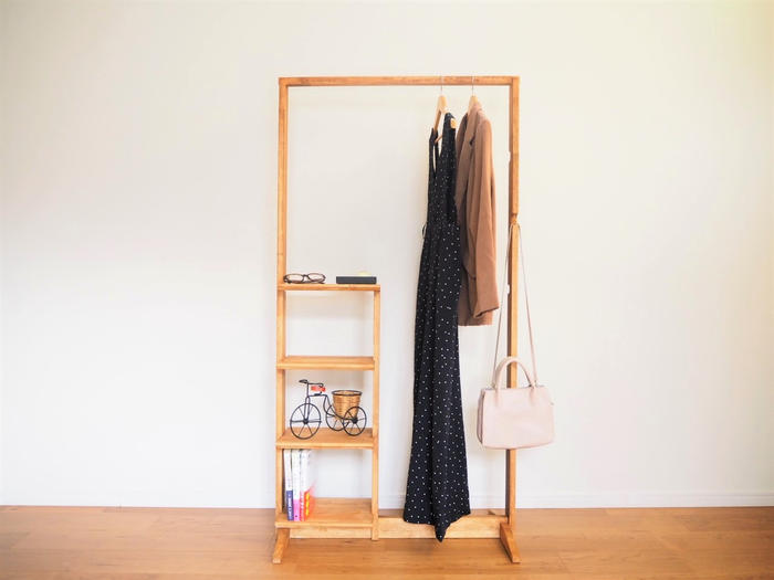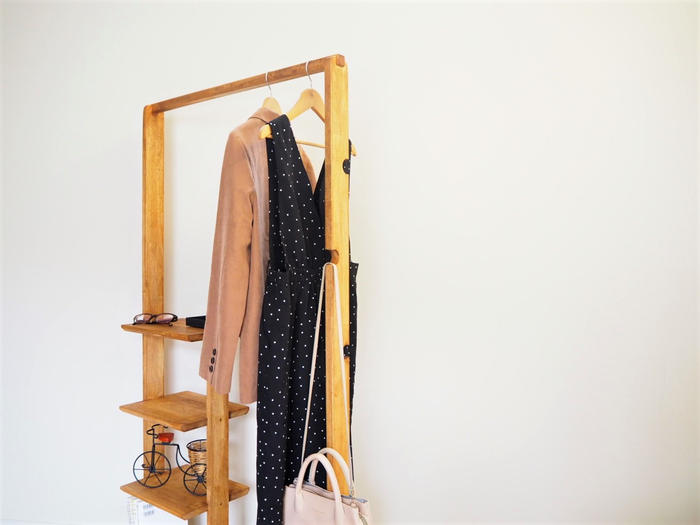 - シンプルでスッキリしたデザインのハンガーラックとなっております。一人暮らしの新生活で使って頂きたい作品となっており、普段使いの服やカバンを掛けて頂き、お気に入りのアクセサリーや、小物、本、小バッグを飾って頂くと、お部屋がごちゃごちゃせずに、スッキリした雰囲気になり、とても、居心地がいい空間になると思います。