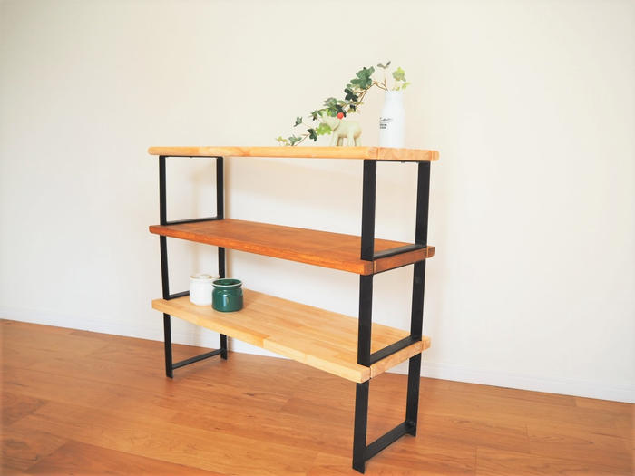 - こちらは、天然木とアイアンの重ねて使うことが出来るスタッキングラックなっており、コンパクトでシンプルなデザインとなっております。特徴としては、脚が、天板に刺さるだけの簡単構造となっているので、2~3個重ねて飾り棚やシューズラックとして使えたり、時には、外してベンチや、ミニテーブルとしてもお使い頂けるので、大変、便利で見た目も可愛い作品となっております。