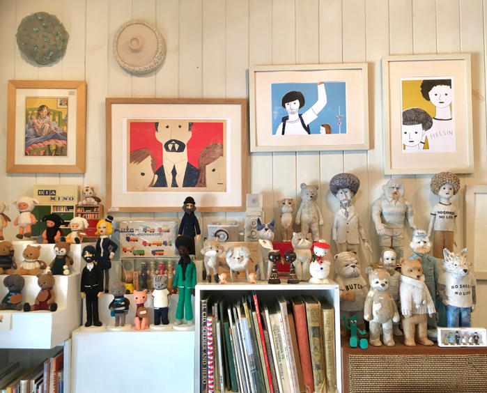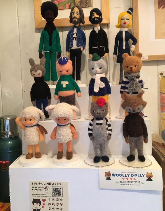 お店の中でイラスト描いたり、人形を作ったりして、そのニードルフェルト人形やボール紙で作る人形、イラストも展示販売しています。