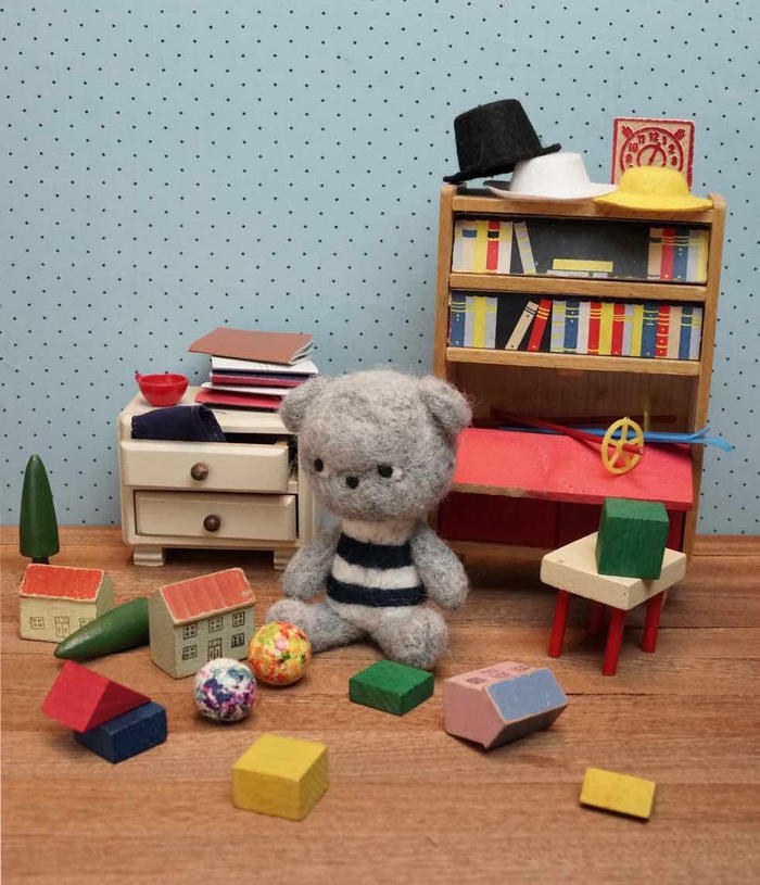 - 最初はニードルフェルトでねこのキャラクターを作ってましたが、お話しを考えてその中で楽しく動かせたら楽しいかなと、人形に合わせてミニチュアセット作ったり、お店にある古いおもちゃと合わせて撮影してポストカードにしてみたりしました。