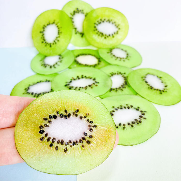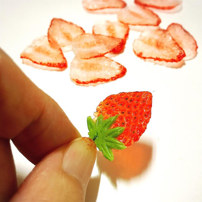 キウイやイチゴの種も、ひと粒ひと粒すべて手作業で色つけしたり種を埋め込んだりしてます。