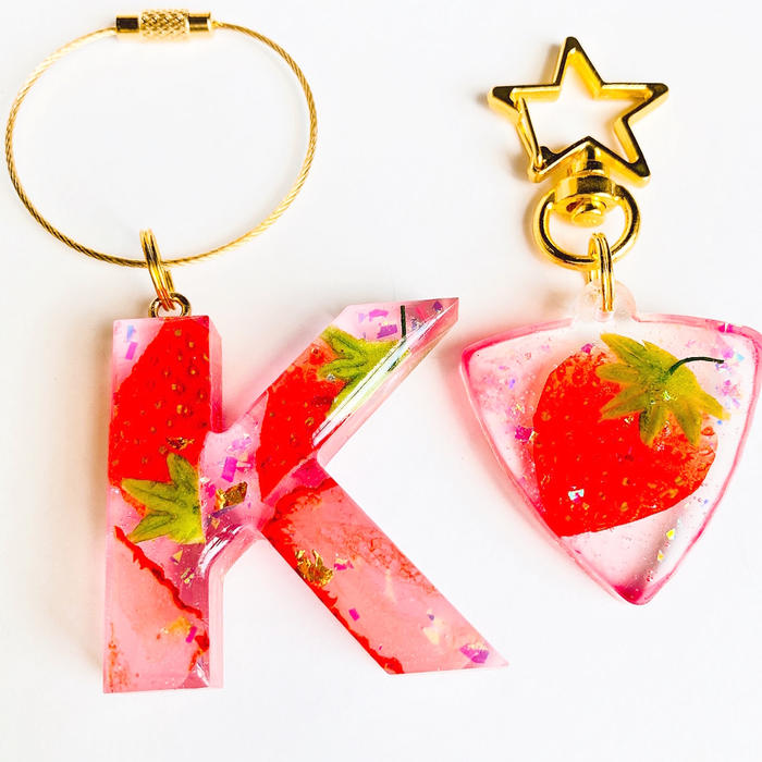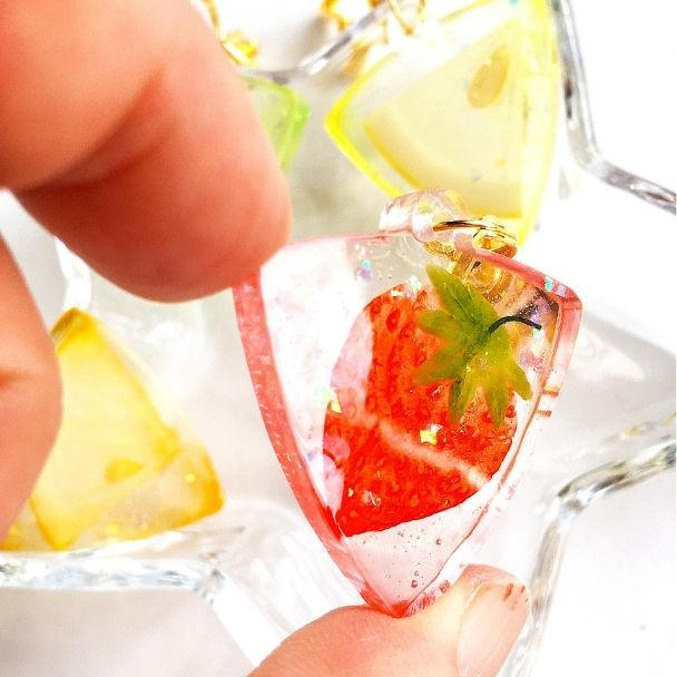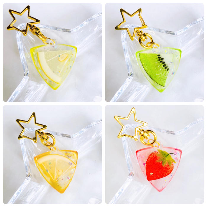 *ピックの中には、フルーツ、ホロが入ります。それぞれのフルーツの色にうっすらと色付けしたレジンを部分使用していますので、まるで果汁が滲み出たようなデザインになっております。