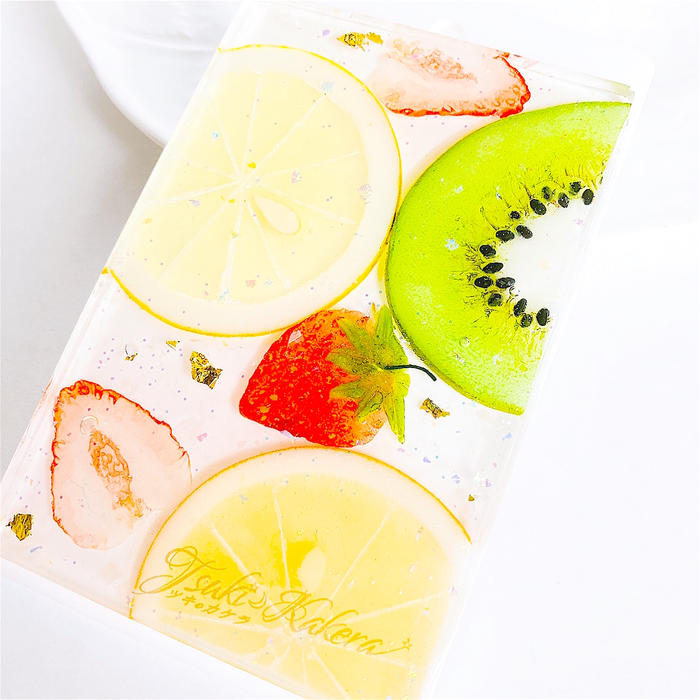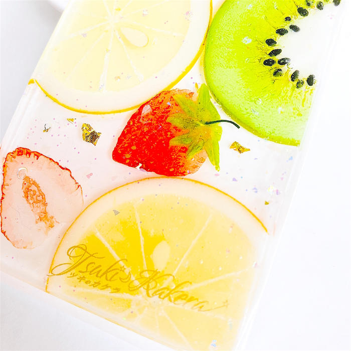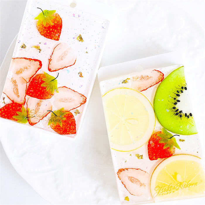- 変色がほとんど無い粘土製の押しフルーツをレジンに閉じ込めパスケースにしました。