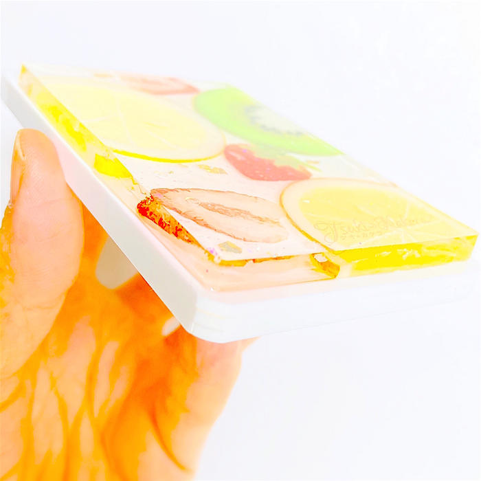 - 2種の苺、レモン、オレンジ、キウイをレジンに閉じ込めました。