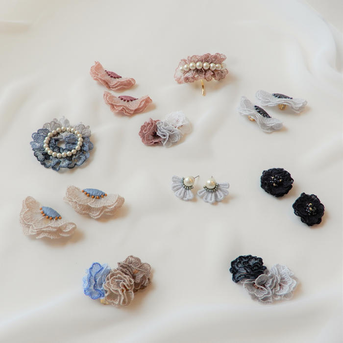 - レースが織りなす特別な存在感と美しさ。昔ヨーロッパではレースは「糸の宝石」を呼ばれていたのだとか。そんなレースで仕立てたアクセサリーは宝石を身につけたときのような幸福感を与えてくれます。
