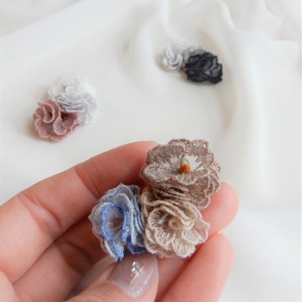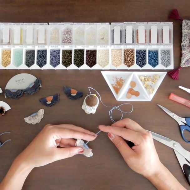 - レースアクセサリーの他にも、ビーズ刺繍やオーガンジー刺繍、タッセルアクセサリーなど、糸や針を使った技法で作品を手掛けています。