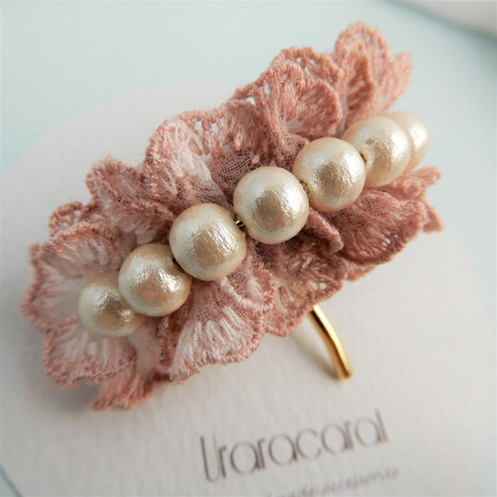 - レースフラワーをアンティークピンクに染め上げ、その上にコットンパールを飾りました。