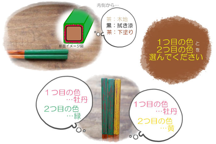 - 10色の色漆からお好きな2色を選んでいただき、全90通りのパターンの中からあなたのリクエストに応じてウルシハジメマシタが箸木地に『変わり塗』の仕掛けを施します。