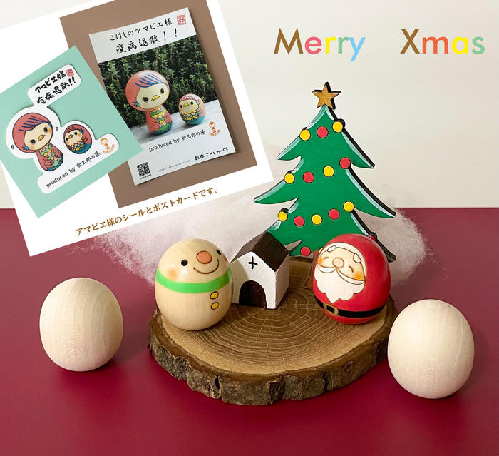 - クリスマスの日には。 サンタさんとスノーマンのこけし飾りでむかえましょう! たまごこけしの木地を2個付けた特別なセットです。 自分オリジナルのサンタ&スノーマンも一緒に作って飾ってみたり、お友達や大切な人へプレゼントしてみては。。。 今回はアマビエ様のシールとポストカード付です!