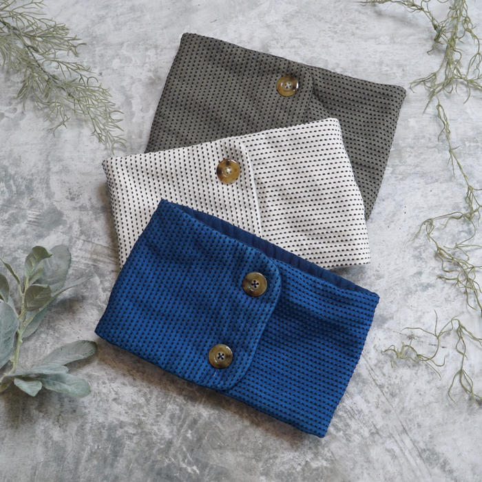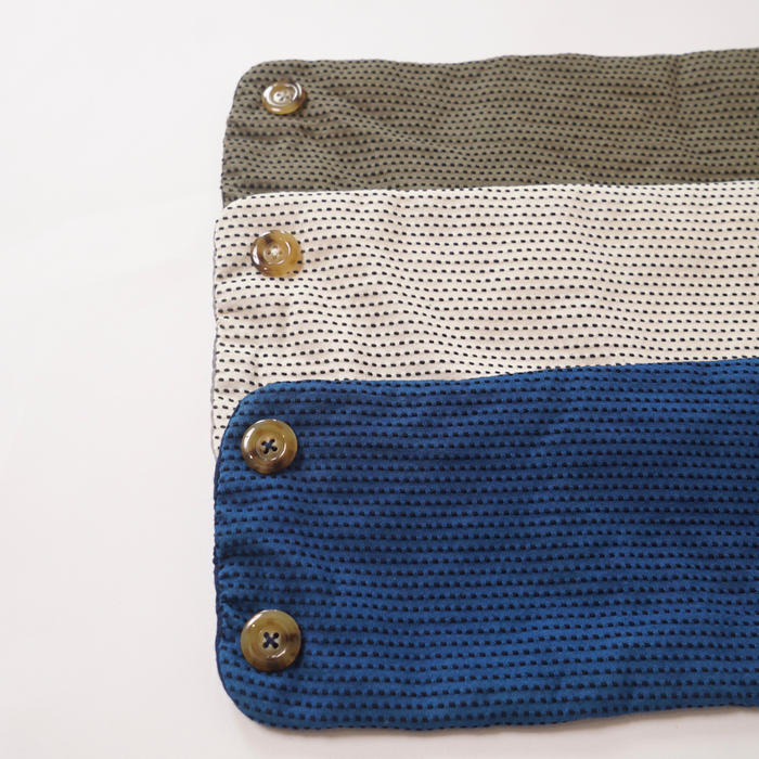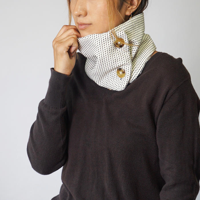 通勤時などのスーツ、コートはもちろん、私服等のカジュアルな格好でも合わせやすく、飽きのこない個性的なデザインです。織物のため伸縮性はありませんが、ボタンでの着脱になっているので、サイズ等関係なく、セットした髪も崩れずにご着用いただけます。