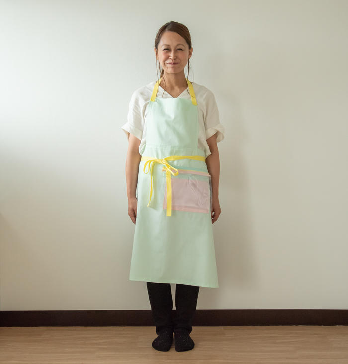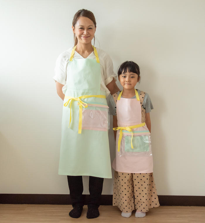 - ⬆ ビニールポケットは取り外し可能。付ける位置も自由に選んで自分仕様なエプロンを作ろう(実際のカラーとは異なります)