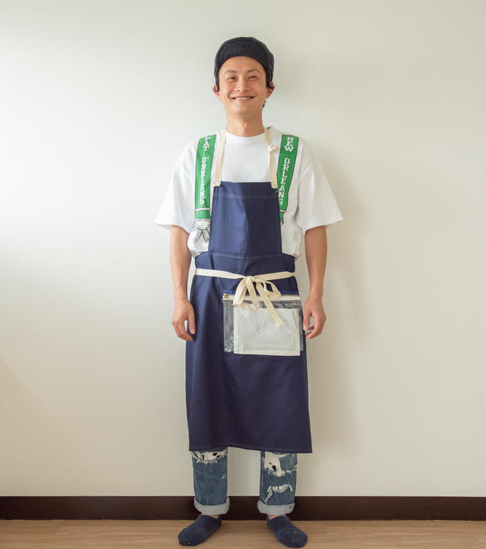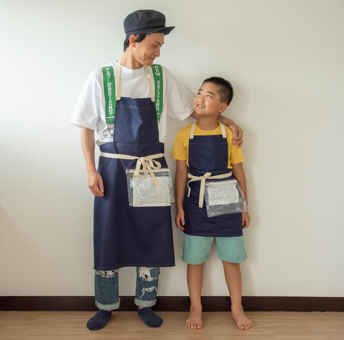 - ⬆ ビニールポケットは取り外し可能。付ける位置も自由に選んで自分仕様なエプロンを作ろう(実際のカラーとは異なります)