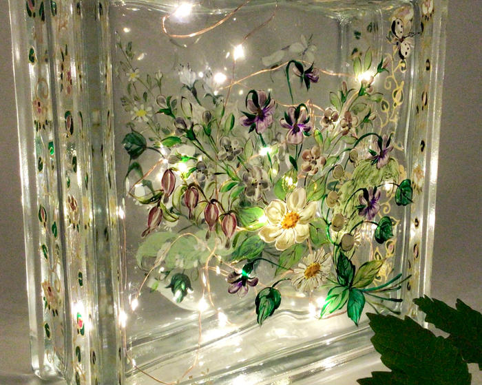 - その「ホワイトブーケ」をいろいろな形で楽しめるガラスブロックに描いてみました。