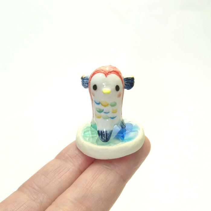 光り輝く姿で海中から現れるということで、海を現したガラスの台座にのせてみました。 -