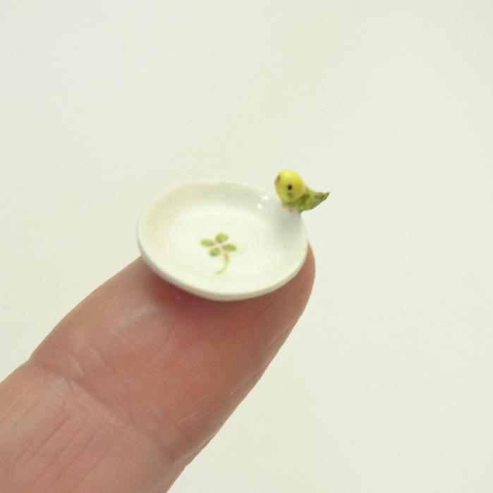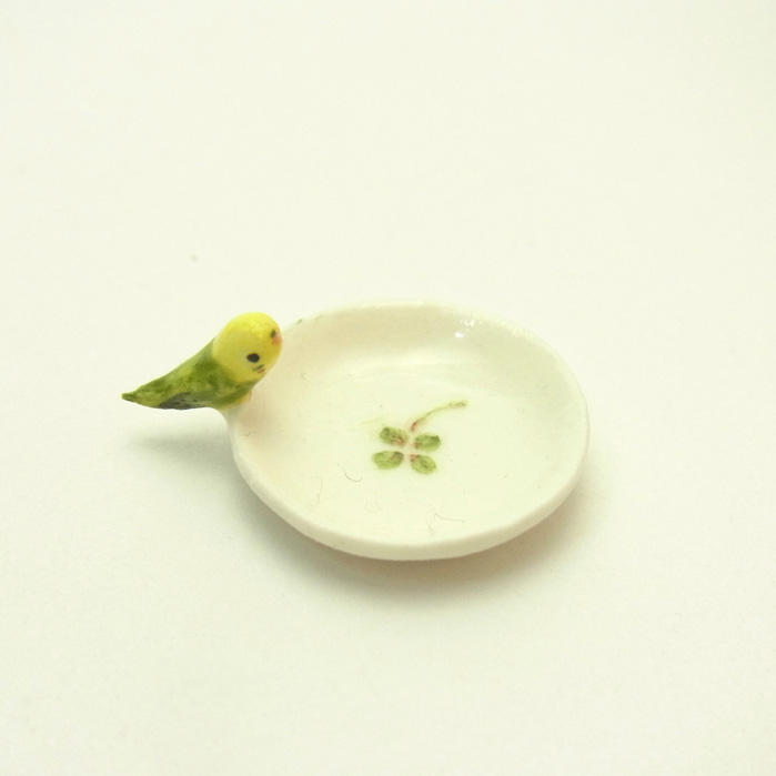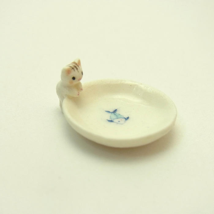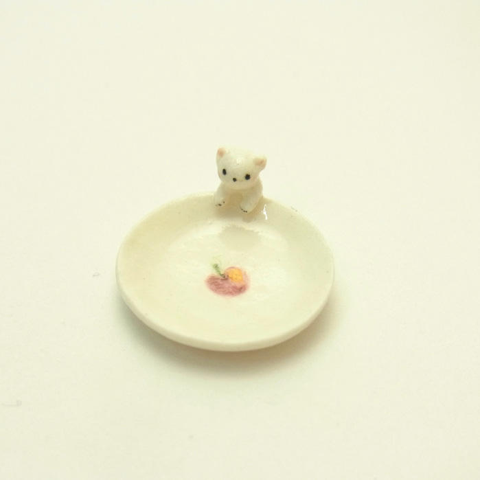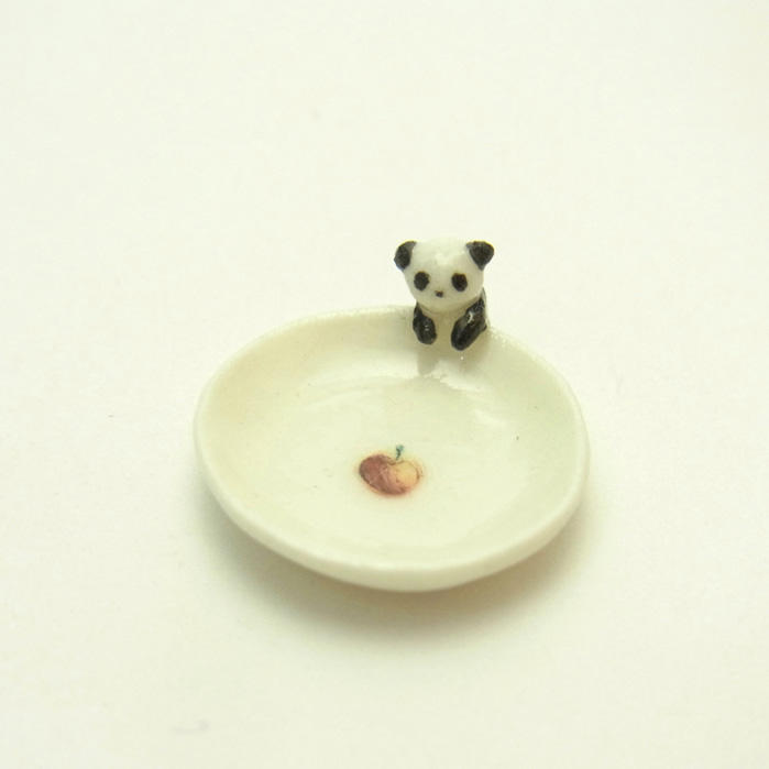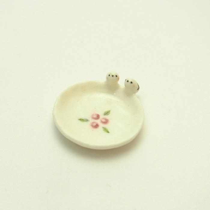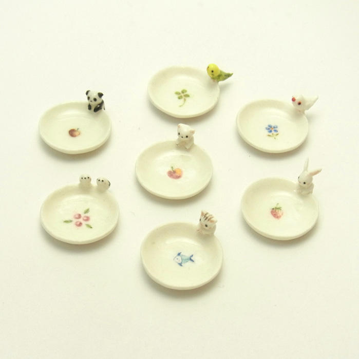 直径約1.5㎝の小皿のふちから小さな動物たちが中をのぞいています。