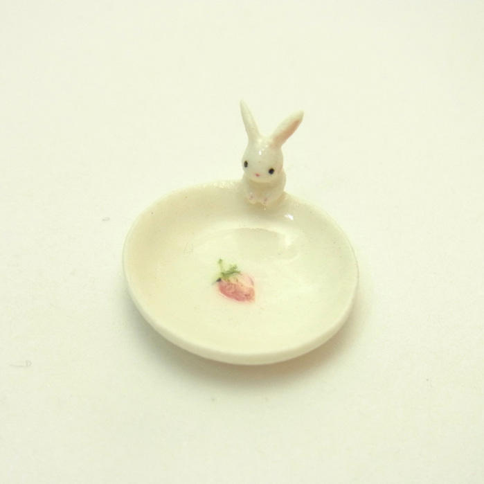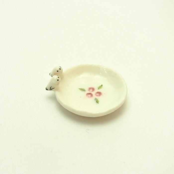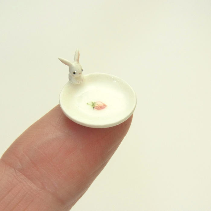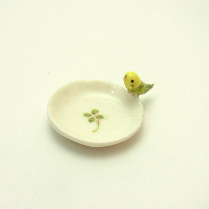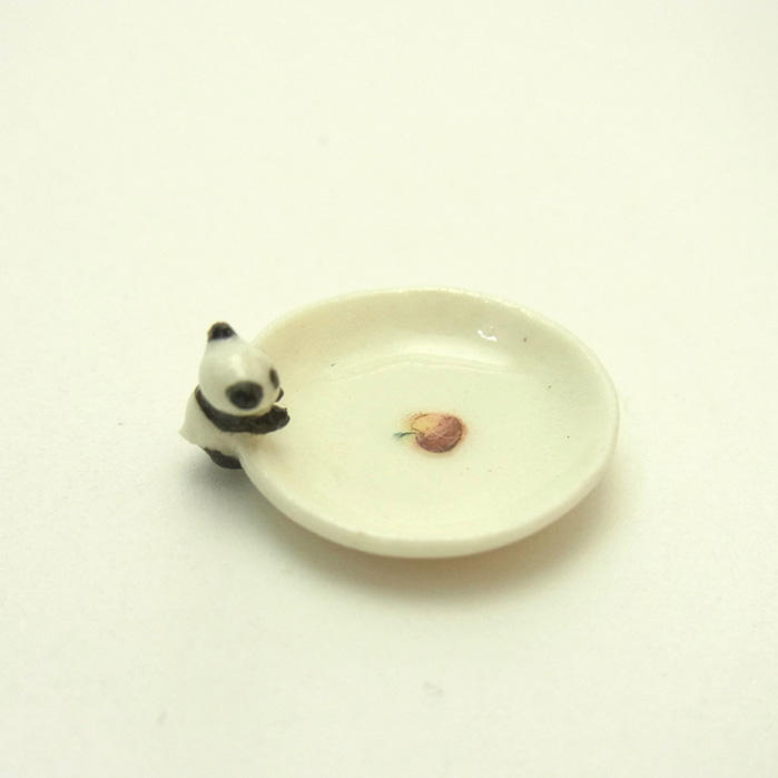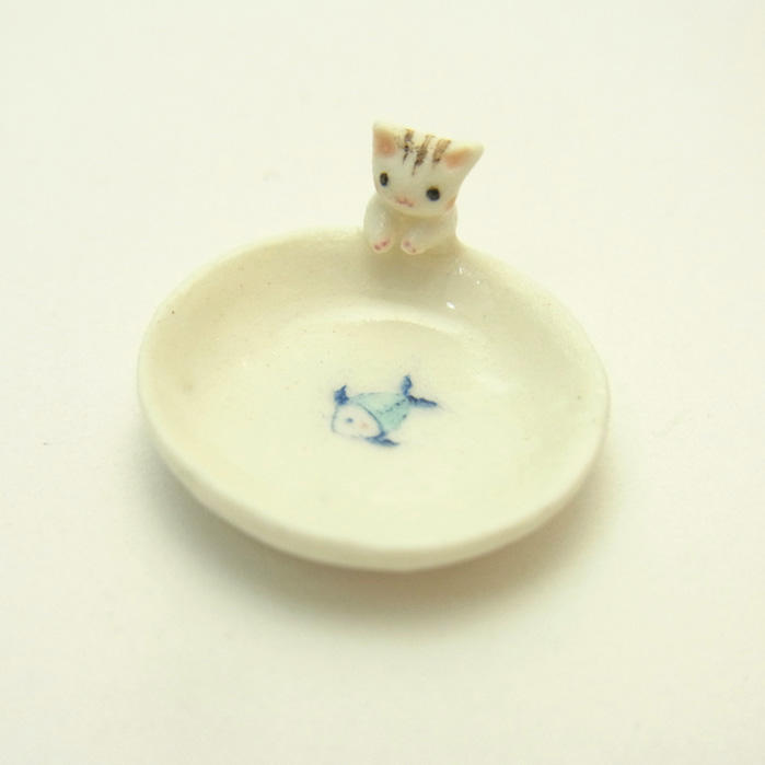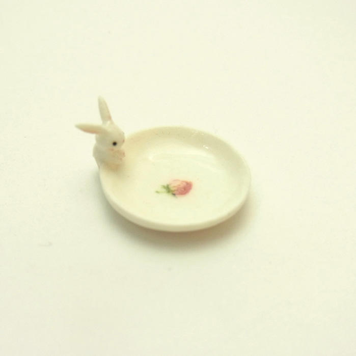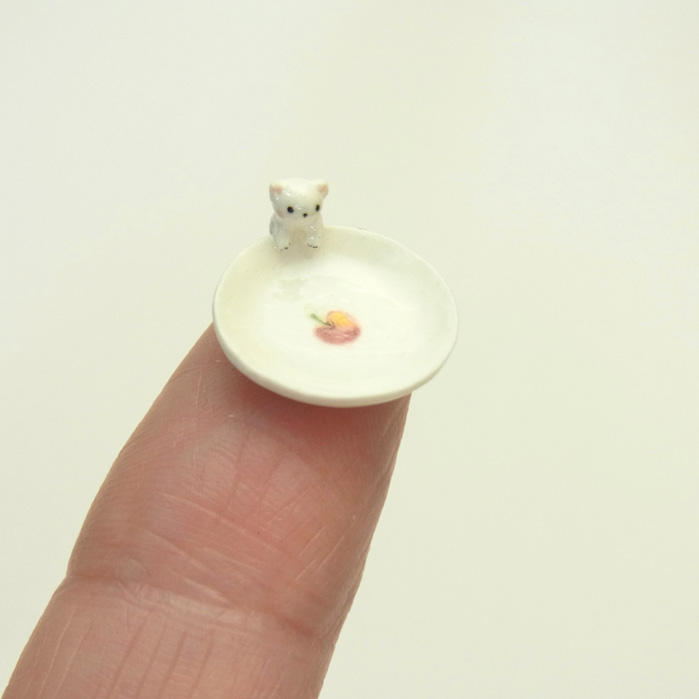 直径約1.5㎝の小皿のふちから小さな動物たちが中をのぞいています。